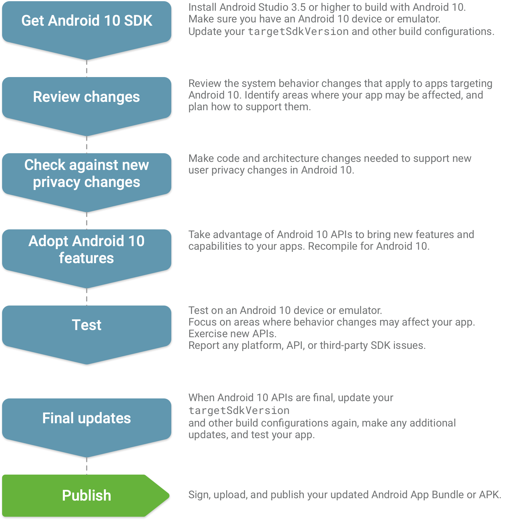เราขอแนะนำให้เผยแพร่แอปเวอร์ชันที่เข้ากันได้โดยเร็วที่สุด (ควรเผยแพร่ก่อนที่อุปกรณ์จะเริ่มได้รับการอัปเดต Android 10) เพื่อให้ผู้ใช้เปลี่ยนไปใช้ Android 10 ได้อย่างราบรื่น