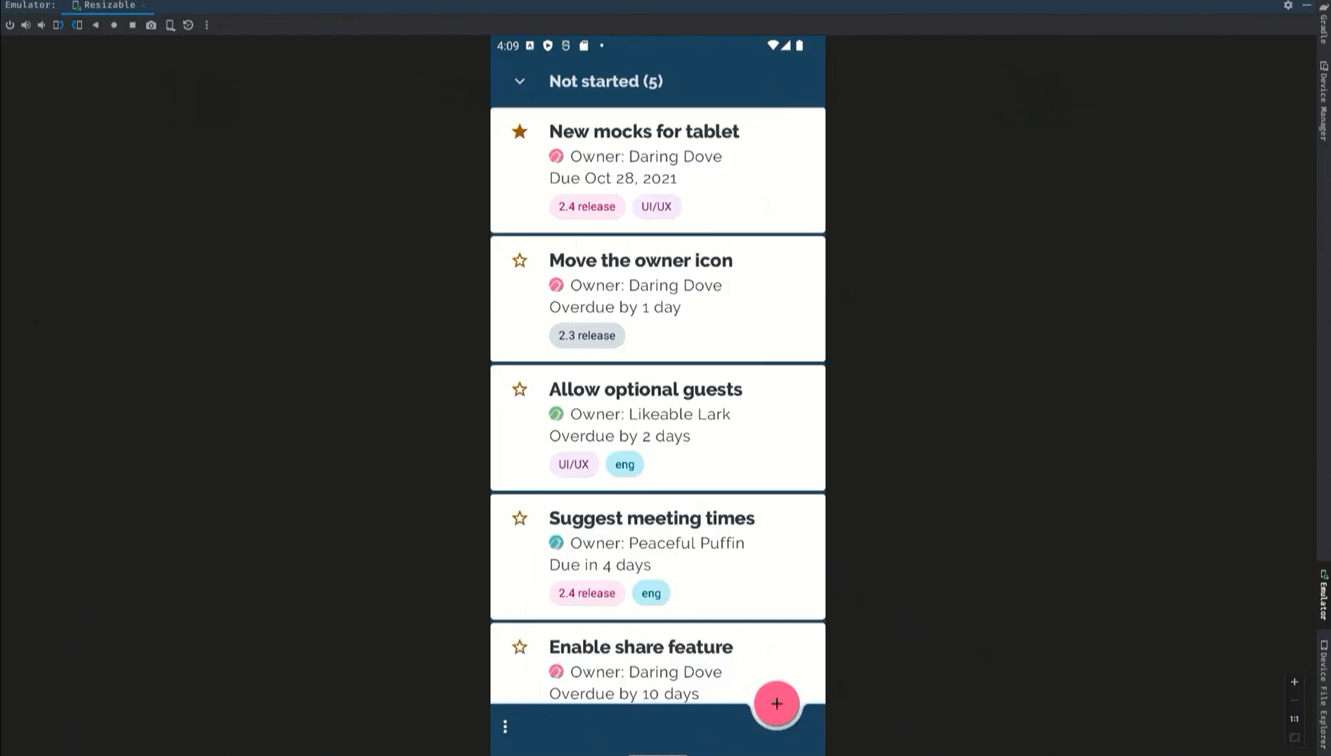 這種彈性讓您可以更輕鬆地在設計時驗證版面配置,並在執行階段使用相同的參照裝置進行行為測試。如要建立新的可調整大小模擬器,請使用 Android Studio 中的「裝置管理工具」建立新的虛擬裝置,然後在「手機」類別中選取「可調整大小」裝置定義。