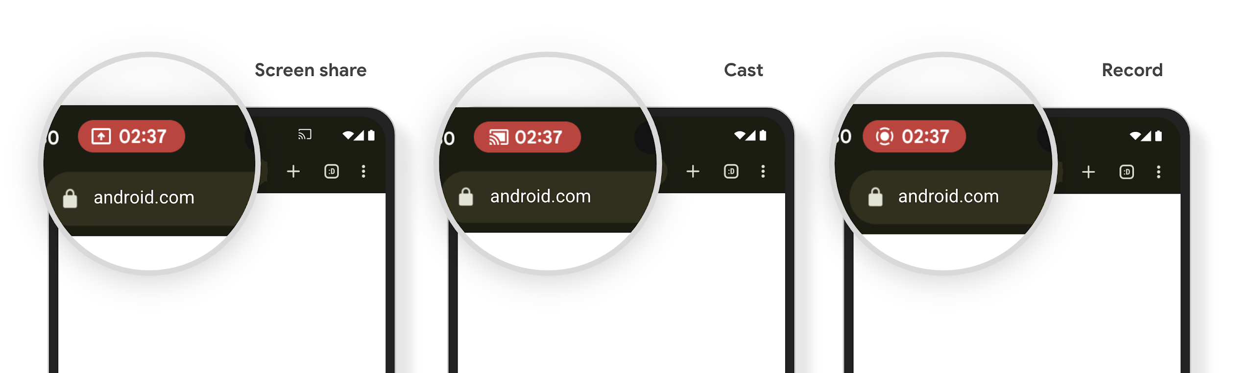 For apps running on devices with Android 15 QPR1 or higher, a status bar chip that is large and prominent alerts users to any in‑progress screen projection. Users can tap the chip to stop their screen from being shared, cast, or recorded. Also, screen projection automatically stops when the device screen is locked.