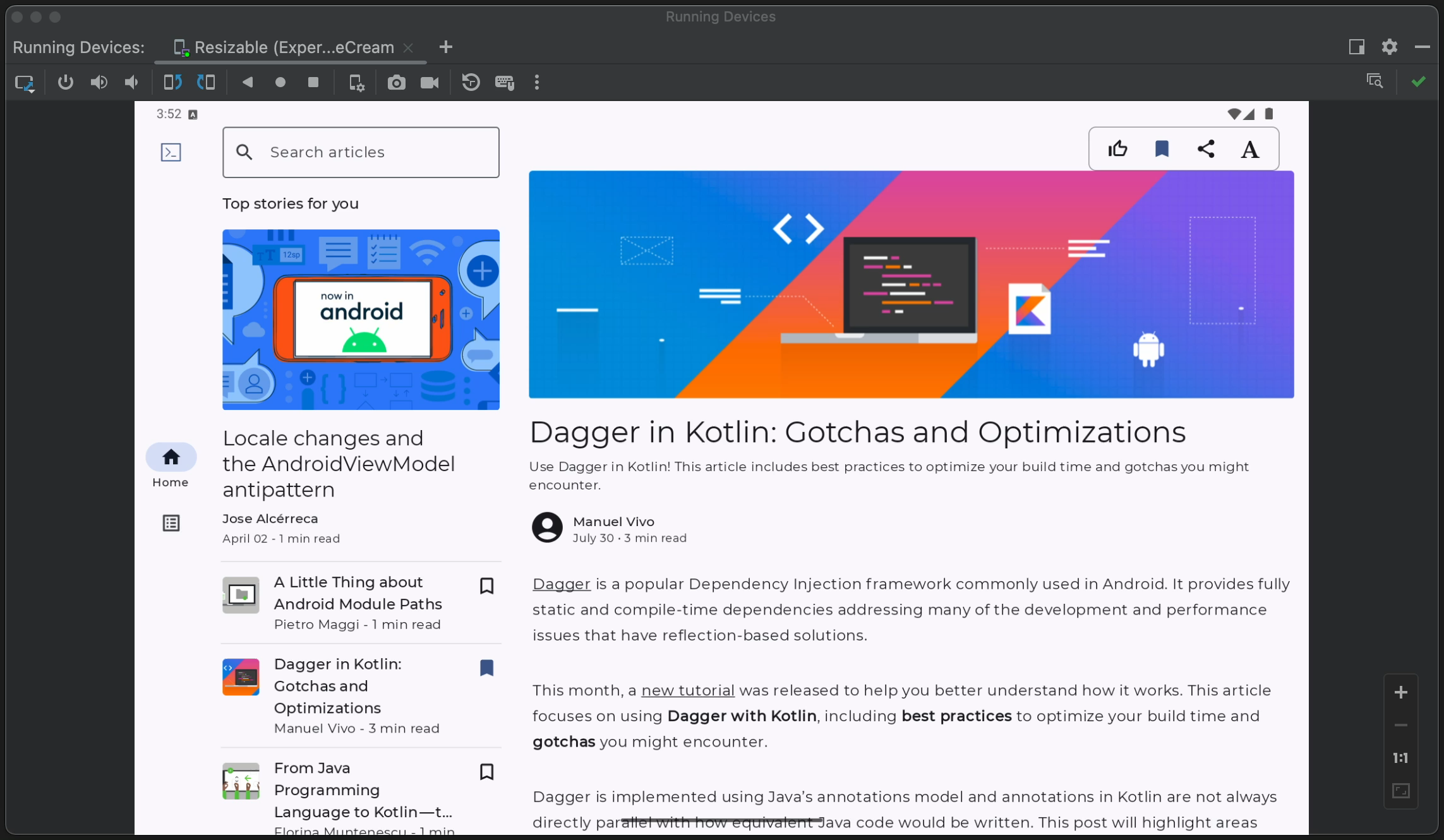 This flexibility makes it easier to both validate your layout at design time and test the behavior at runtime, using the same reference devices. To create a new resizable emulator, use the Device Manager in Android Studio to create a new virtual device and select the Resizable device definition in the Phone category.