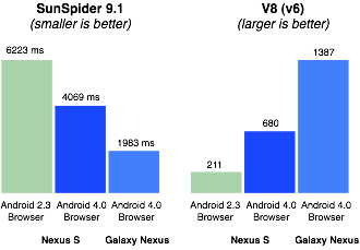 Android Tarayıcı, tüm içerik türlerinde WebKit çekirdeğinin ve JavaScript için V8 Crankshaft derleme motorunun güncellenmiş sürümleri sayesinde önemli ölçüde iyileştirilmiş sayfa oluşturma performansı sunar. Nexus S cihazda çalıştırılan karşılaştırma testlerinde Android 4.0 tarayıcı, V8 Karşılaştırma Paketi'nde Android 2.3 tarayıcıya kıyasla yaklaşık% 220, SunSpider 9.1 JavaScript Karşılaştırma Testi'nde ise% 35'ten fazla iyileşme gösterdi. Android 4.0 tarayıcısı, Galaxy Nexus cihazda çalıştırıldığında V8 karşılaştırmasında yaklaşık %550, SunSpider karşılaştırmasında ise yaklaşık% 70 oranında iyileşme gösterdi.