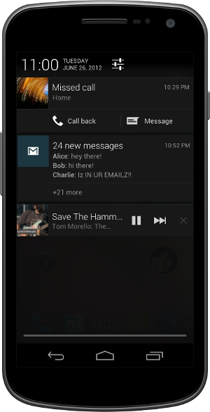 Le notifiche sono da tempo una funzionalità popolare di Android perché consentono agli utenti di visualizzare informazioni e aggiornamenti di tutto il sistema in un unico posto. Ora in Android 4.3, le app possono osservare lo stream di notifiche con l'autorizzazione dell'utente e visualizzarle nel modo che preferiscono, inclusa la loro invio a dispositivi nelle vicinanze connessi tramite Bluetooth.