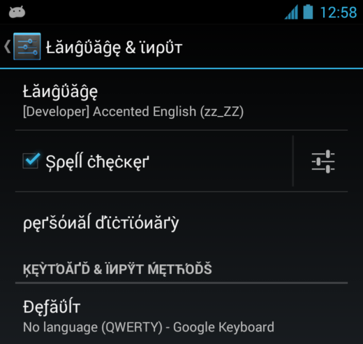 Per aiutarti a testare più facilmente la tua app in altre lingue, Android 4.3 introduce gli pseudo-codici paese come nuova opzione per gli sviluppatori. Le pseudo-impostazioni internazionali simulano la lingua, lo script e le caratteristiche di visualizzazione associate a un'impostazione internazionale o a un gruppo di lingue. Al momento, puoi eseguire il test con un pseudo-locale per l'inglese con accento, che ti consente di vedere come funziona la tua UI con gli accenti e i caratteri delle scritture utilizzati in una serie di lingue europee.