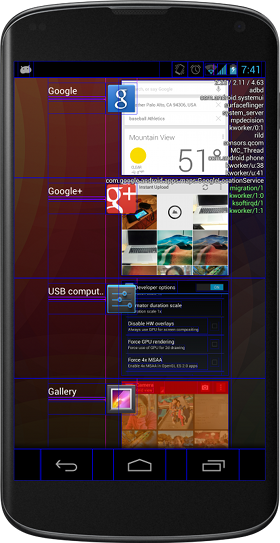 Android 4.3 bao gồm các tính năng cải thiện hiệu suất RTL và hỗ trợ RTL rộng hơn trên các tiện ích giao diện người dùng khung, bao gồm cả ProgressBar/Spinner và ExpandableListView. Bạn có thể xem thêm thông tin gỡ lỗi thông qua công cụ uiautomatorviewer