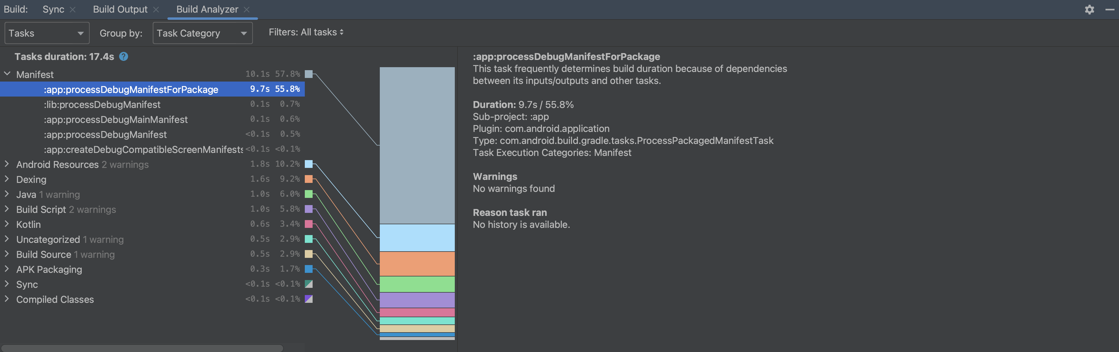 Aby wyświetlić zestawienie zadań, które przyczyniają się do czasu trwania kompilacji, kliknij Zadania wpływające na czas trwania kompilacji na stronie przeglądu lub wybierz z menu Zadania. Jeśli Twój projekt korzysta z AGP w wersji 8.0 lub nowszej, zadania są domyślnie pogrupowane według kategorii, dzięki czemu łatwiej jest zidentyfikować obszary, które wpływają na czas trwania kompilacji. Kliknij każde zadanie podrzędne, aby dowiedzieć się więcej o jego wykonaniu.