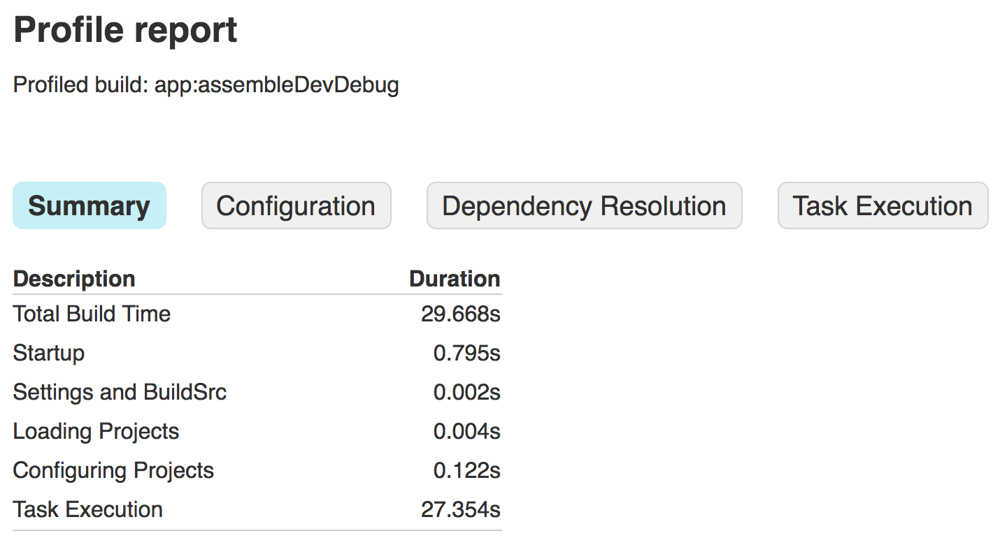 그렇게 하려면 Gradle이 빌드 수명 주기의 각 단계와 각 빌드 작업을 실행하는 데 얼마나 시간이 걸리는지를 프로파일링하면 됩니다. 예를 들어, 빌드 프로필에 Gradle이 프로젝트를 구성하는 데 너무 많은 시간을 소모한다고 나타난다면 빌드 프로필에서 맞춤 빌드 로직을 구성 단계에서 삭제하라고 제안할 수 있습니다.