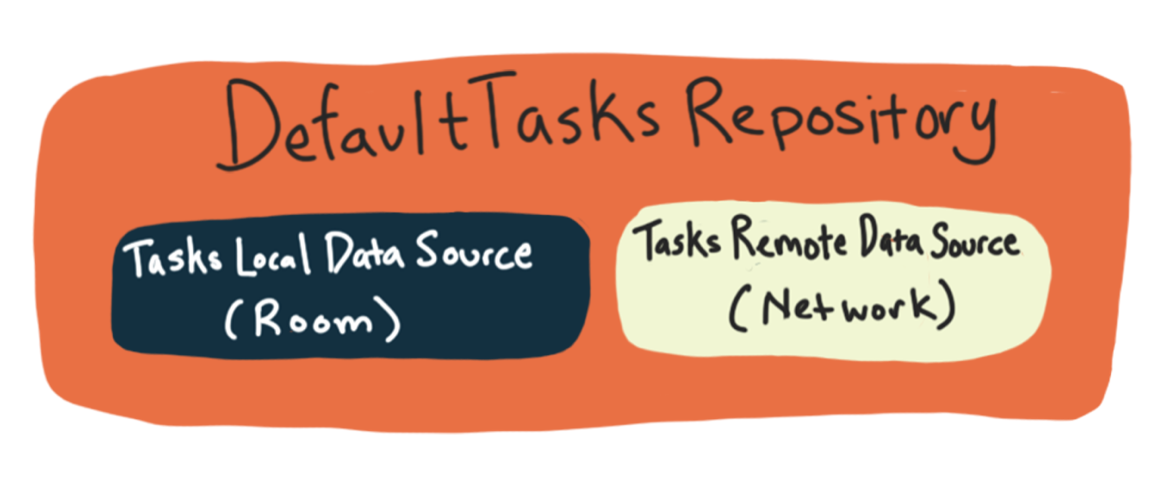 So every method in DefaultTasksRepository calls methods on data source classes, which in turn call methods in other classes to save information to a database or communicate with the network.