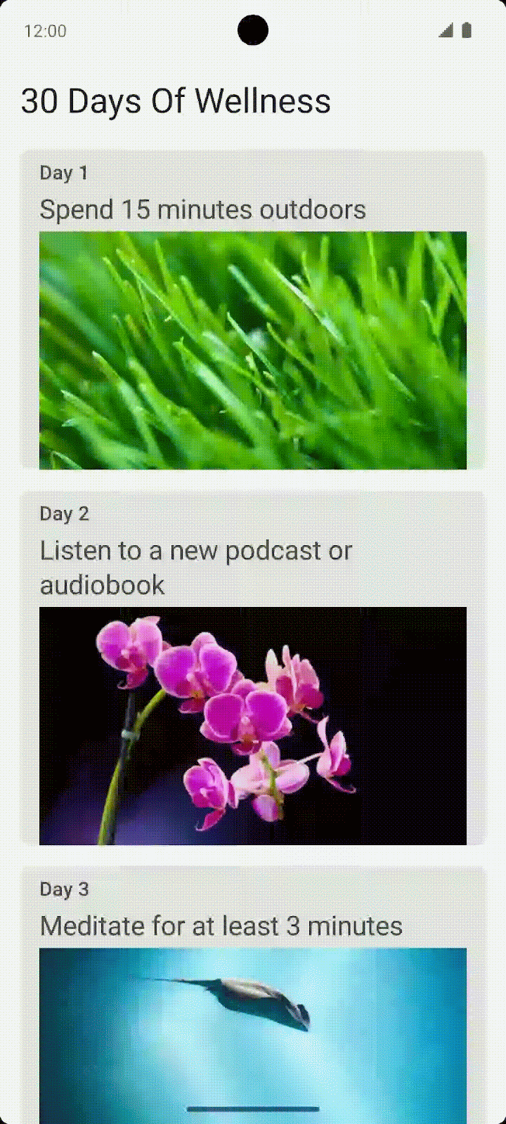 Une autre option de conception consiste à utiliser une grille différée. Il existe des versions verticales ( LazyVerticalGrid) et horizontales ( LazyHorizontalGrid), selon la conception de votre application.
