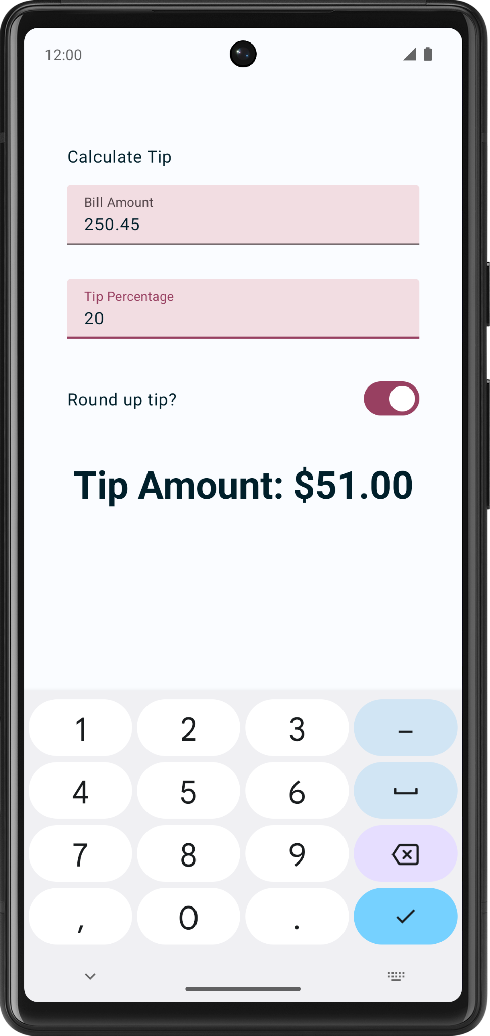 Columndari fungsiTipTimeLayout()setelah kolom teks Tip Percentage. Panggil fungsiRoundTheTipRow()dengan argumen berikut: parameter bernamaroundUpditetapkan keroundUpdan parameter bernamaonRoundUpChangedditetapkan ke callback lambda yang memperbarui nilairoundUp: