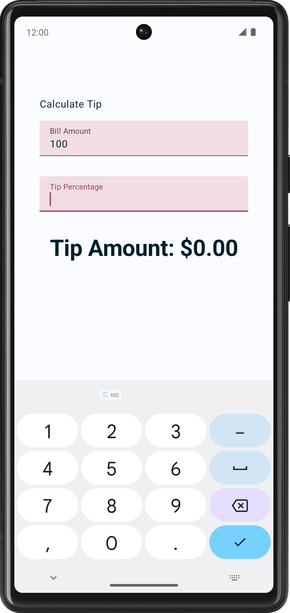 Neste codelab, você vai usar o código da solução do codelab Introdução ao estado no Compose para criar uma calculadora interativa de gorjetas que pode calcular e arredondar um valor ao inserir a conta e a porcentagem da gorjeta. Confira o app final nesta imagem: