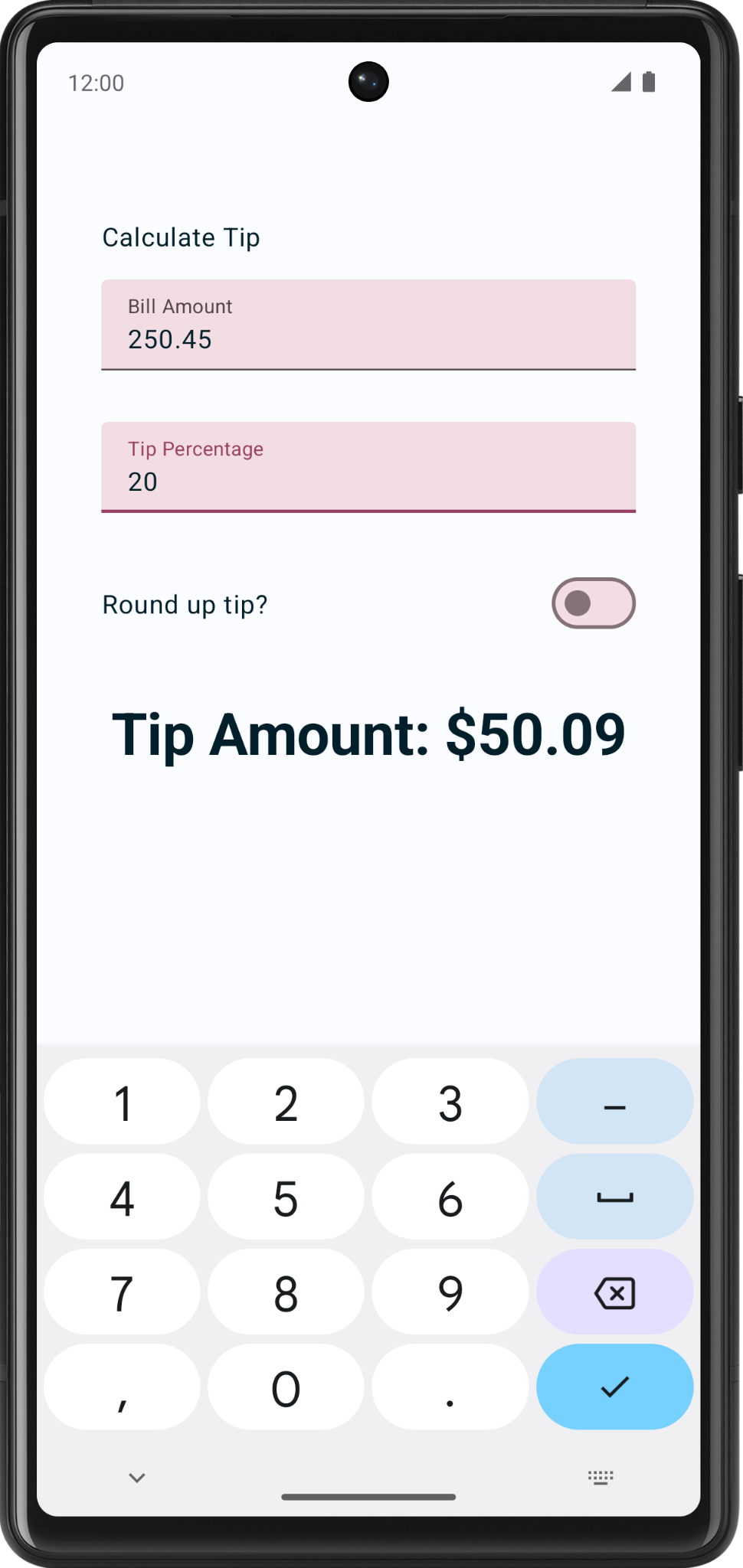 Trong lớp học lập trình này, bạn sẽ sử dụng mã nguồn giải pháp từ lớp học lập trình Giới thiệu về trạng thái trong Compose để tạo một công cụ tính tiền boa mang tính tương tác. Công cụ này có thể tự động tính toán và làm tròn số tiền boa khi bạn nhập số tiền trên hoá đơn và tỷ lệ phần trăm boa. Dưới đây là ảnh chụp màn hình khi ứng dụng đã hoàn thiện.