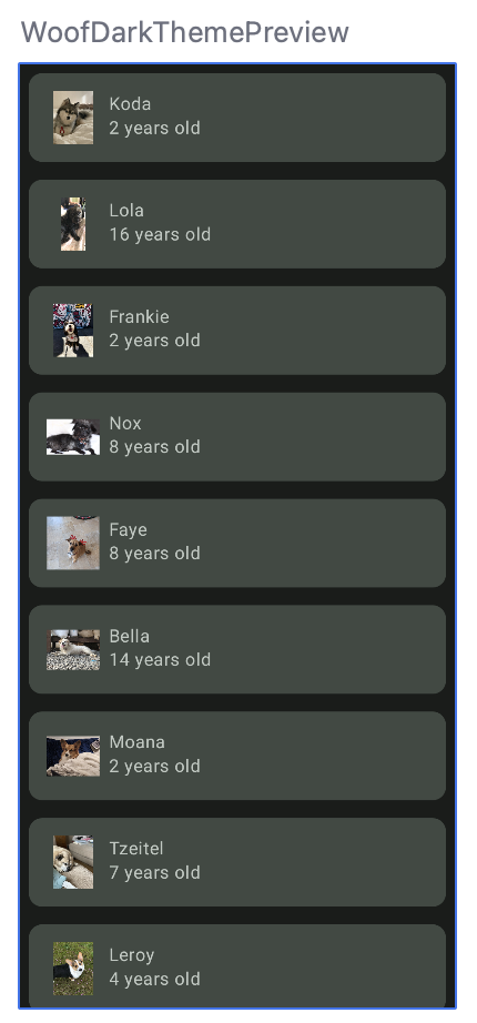 Echa un vistazo a WoofPreview(). Se agrega WoofTheme() para proporcionar los Temas de Material que ves en WoofPreview().