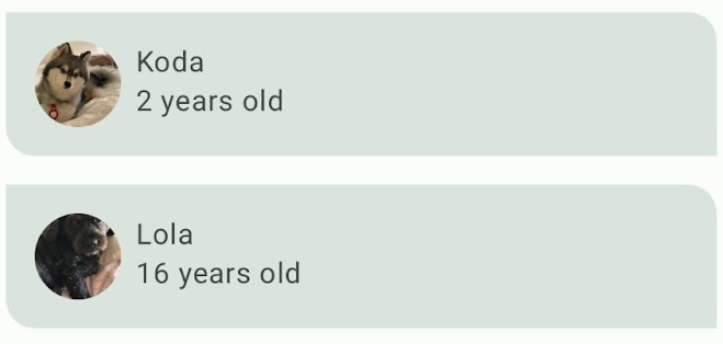 displayMediumsebagai gaya untukdogNamekarena merupakan informasi singkat yang penting. TambahkanbodyLargesebagai gaya untukdogAgekarena berfungsi cukup baik dengan ukuran teks yang lebih kecil.