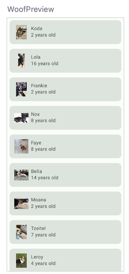 WoofApp()berisiLazyColumnyang menampilkanDogItem.DogItem()berisiRowyang menampilkan foto anjing dan informasi tentangnya.DogIcon()menampilkan foto anjing.DogInformation()menampilkan nama dan usia anjing.WoofPreview()memungkinkan Anda melihat pratinjau aplikasi di panel Design.