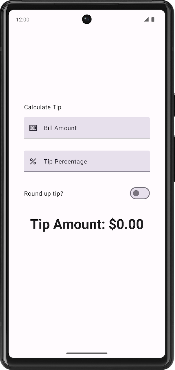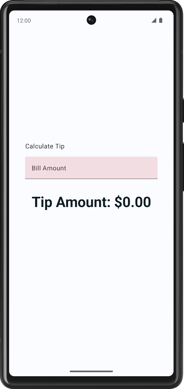 学完此 Codelab 后,您的小费计算器应用将如以下屏幕截图所示。在用户输入 Bill Amount(账单金额)后,您的应用将显示建议的小费金额。目前,小费百分比已硬编码为 15%。在下一个 Codelab 中,您将继续构建该应用并添加更多功能,例如设置自定义小费百分比的功能。