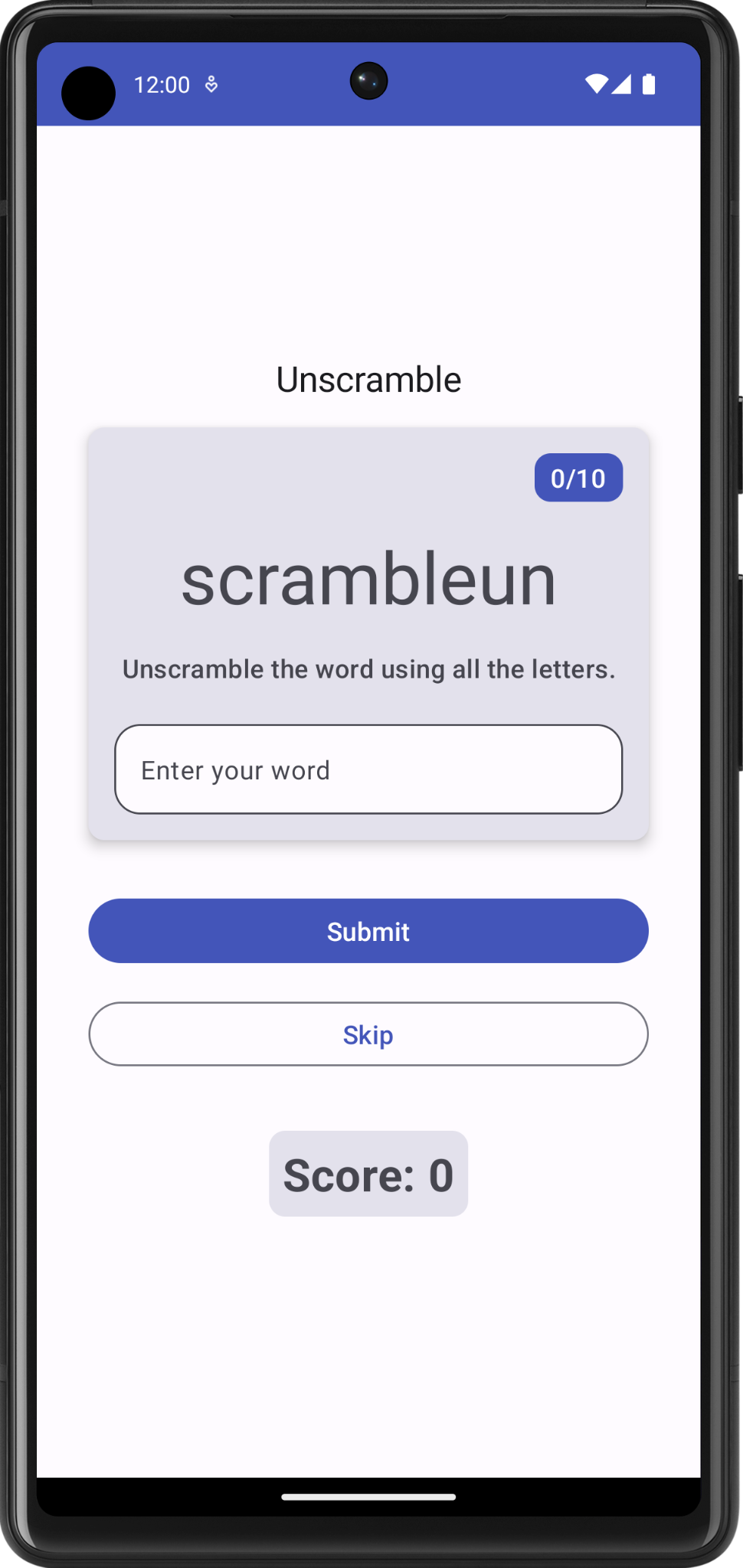 La app de Unscramble es un juego de palabras desordenadas de un solo jugador. La app muestra una palabra desordenada, y el jugador debe adivinarla a partir de las letras que se muestran. El jugador gana puntos si la palabra es correcta. De lo contrario, el jugador puede intentar adivinar la palabra cualquier cantidad de veces. La app también tiene la opción de omitir la palabra actual. En la esquina superior derecha, la app muestra el recuento de palabras, que es la cantidad de palabras desordenadas que se usaron en el juego actual. Hay 10 palabras por partida.