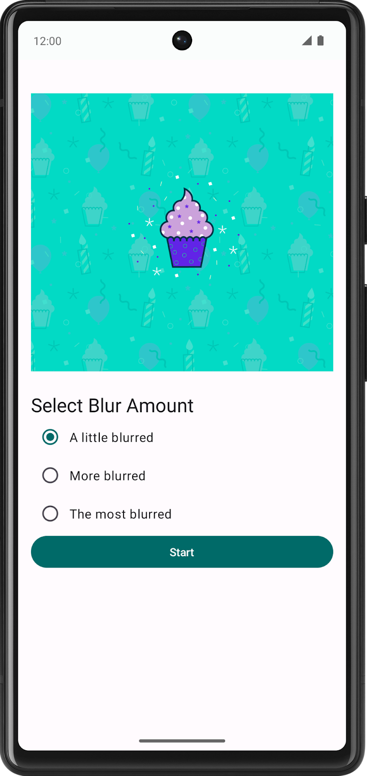 . The composable functions show the image and include radio buttons to select the desired blur level.
