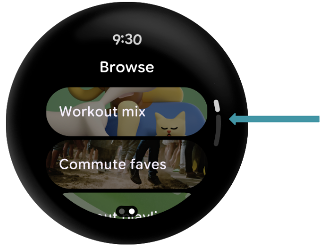 • A ScrollIndicator which is an indicator on the right side of the screen to show the current indicator location based on the type of state object you pass in. In our case, that will be the TransformingLazyColumnState.