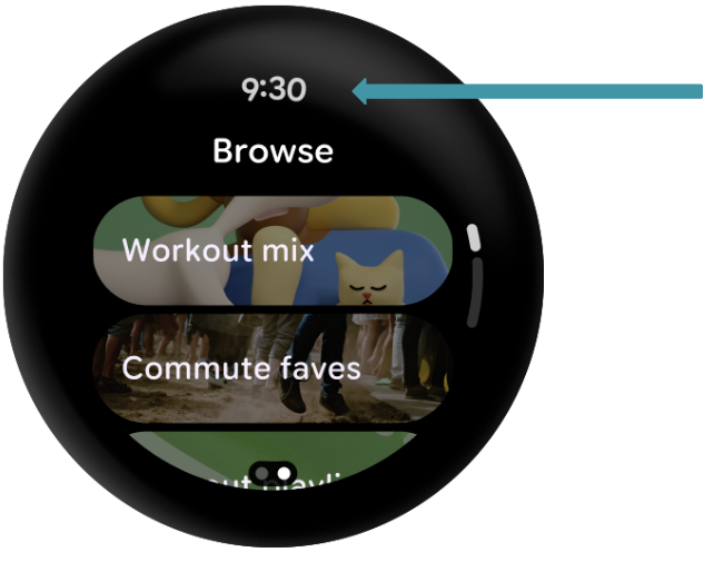• A TimeText which uses curved text under the hood and gives developers an easy way to show the time without placing the composable or having to do any work with time related classes. Additionally, the Material Guidelines recommend that you display the time at the top of any screen within the app and it fades away while scrolling.