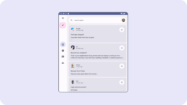 Los diseños canónicos de pantalla grande son patrones de diseño comprobados que proporcionan una experiencia del usuario óptima en dispositivos con pantalla grande. Los diseños son responsivos y adaptables, y son compatibles con teléfonos de pantalla pequeña, así como con tablets, plegables y dispositivos ChromeOS.
