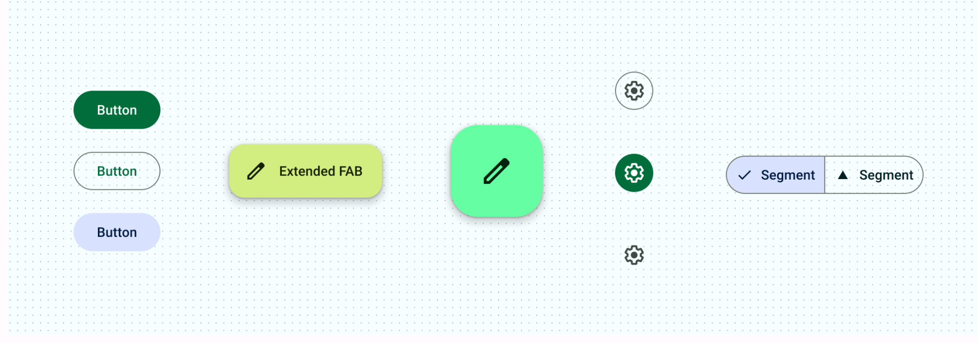 マテリアルには、さまざまなコンテキストでのアクションと操作の優先度を定義するのに役立つ、複数のタイプのボタンがあります。主要アクション用の FAB または拡張 FAB から、アイコンボタンのサポート、分割されたボタンを使用したオプションの選択など。
