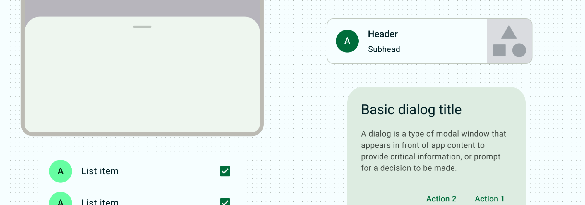 包含コンポーネントは、ボタン、メニュー、チップなどの他のコンポーネントを含む情報とアクションを保持します。ほとんどのマテリアル コンポーネントは明示的な包含を使用し、関連するコンテンツとアクションをビジュアル オブジェクト(カード、ダイアログ、ボトムシート、サイドシート、カルーセル、ツールチップ)でグループ化します。リストは、暗黙的に包含することも、可視分割線を表示することで明示的に提供することもできます。これらのコンポーネントは、コンテンツ グループを表示するための共通のパターンを提供します。