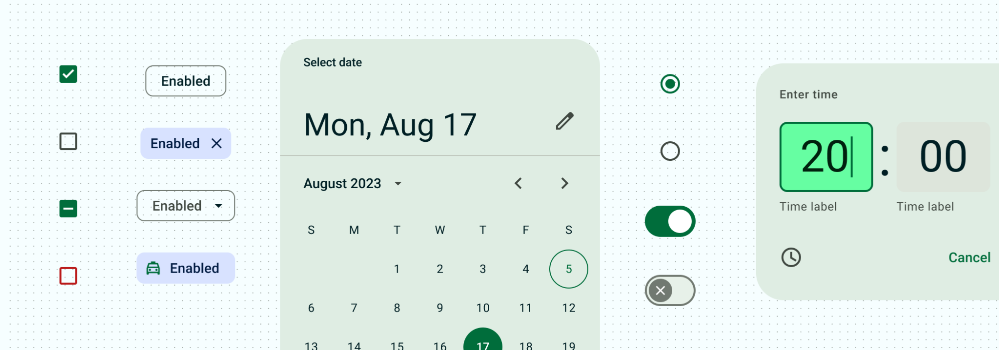 選択コンポーネントを使用すると、ユーザーは選択肢を指定できます。チェックボックスとラジオボタンを使用したフォームの作成、チップを使用したフィルタリング、スイッチとスライダーによる設定の切り替えなど、選択コンポーネントを使用すると、ユーザーは意思決定を制御および入力できます。