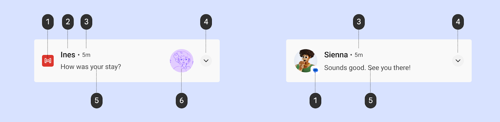 6 نماد بزرگ (اختیاری): ممکن است یک تصویر اضافه شود تا اعلان را به روشی معنادار تقویت کند، مانند پیامی که شامل آواتار فرستنده است.
