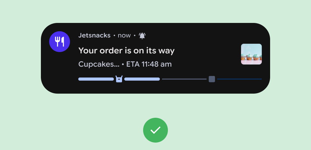 Gli aggiornamenti in tempo reale forniscono un riepilogo degli aggiornamenti importanti in modo che gli utenti possano monitorare l'avanzamento senza aprire l'app. Gli utenti possono ignorare temporaneamente o retrocedere una notifica di aggiornamento in tempo reale a una notifica standard. Le notifiche relative agli aggiornamenti in tempo reale devono rispettare i principi di notifica per fornire informazioni brevi, tempestive e pertinenti.