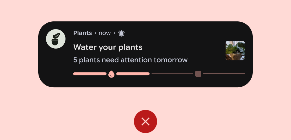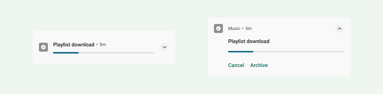 Il modello di avanzamento è progettato per le attività avviate dall'utente che richiedono tempo per essere completate. Quando è espansa, una notifica che utilizza questo modello mostra una barra di avanzamento e include anche un'azione "Annulla" che consente all'utente di terminare questa attività. Le attività non annullabili non richiedono notifiche.