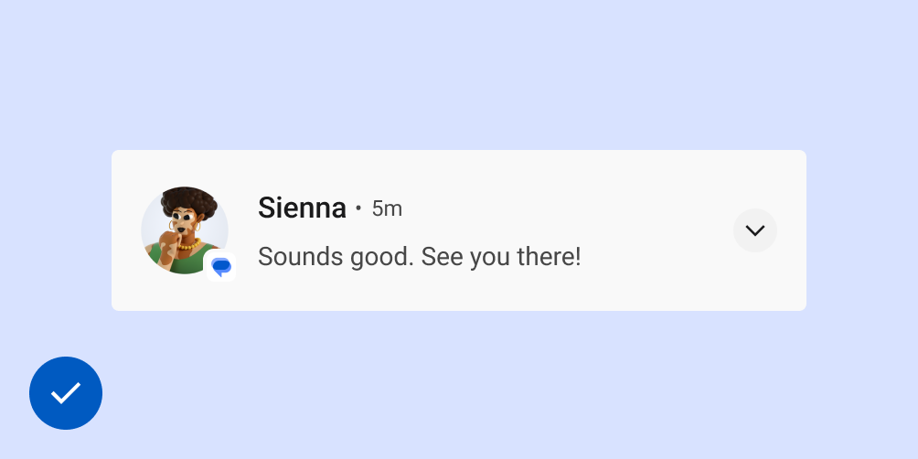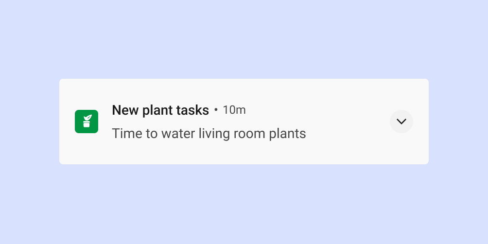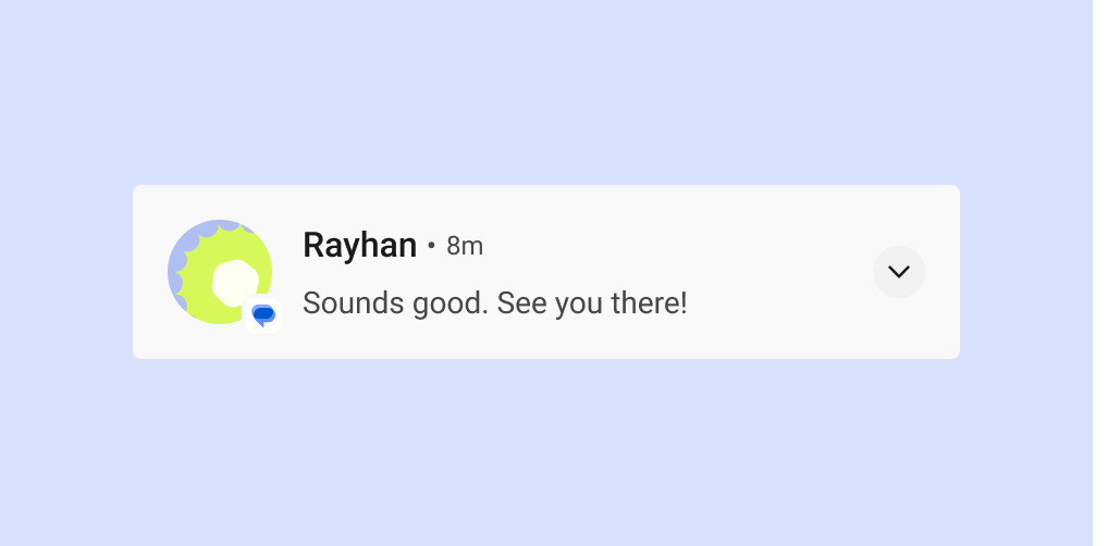 Visualizza una visualizzazione espansa della notifica: nell'intestazione viene visualizzato un indicatore di espansione. Un utente può toccare l'indicatore o scorrere verso il basso il corpo della notifica per espanderla.