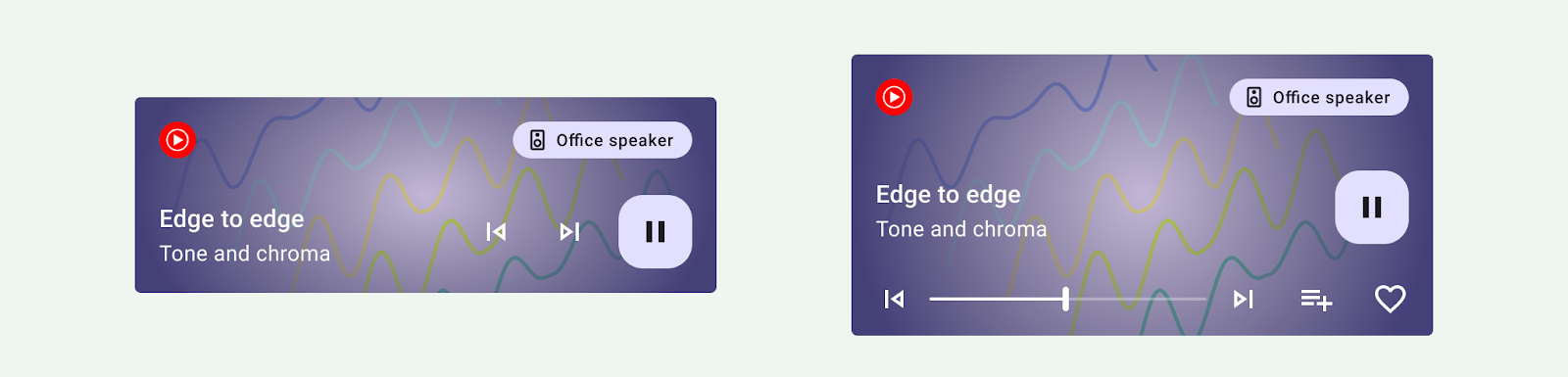 Per la maggior parte degli stili, il sistema applica questo colore solo se la notifica riguarda un servizio in primo piano. Tuttavia, non è previsto questo requisito per le notifiche MediaStyle e DecoratedMediaCustomViewStyle a cui è associata una sessione multimediale.