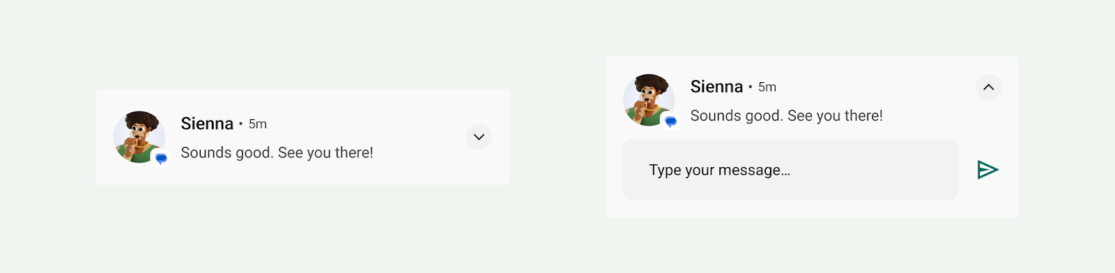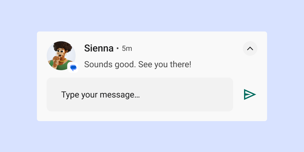 Consenti all'utente di digitare direttamente in una notifica includendo un'azione di risposta. È progettato per digitare una piccola quantità di testo, ad esempio per rispondere a un messaggio o prendere una breve nota.