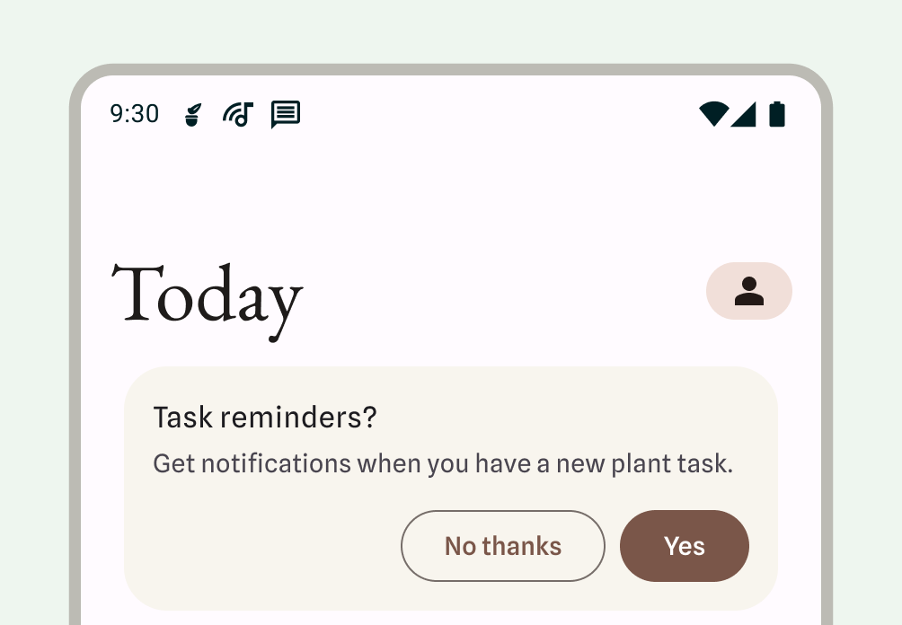 - Fornisci un'interfaccia utente contestuale, che metta in relazione la notifica con le relative funzionalità o con ciò che colpisce. Questa UI può assumere qualsiasi forma per integrarsi al meglio all'interno della tua app: ad esempio, una scheda all'interno di una tariffa, un riquadro in basso o una schermata di onboarding. Qualsiasi di queste dovrebbe essere ignorabile.