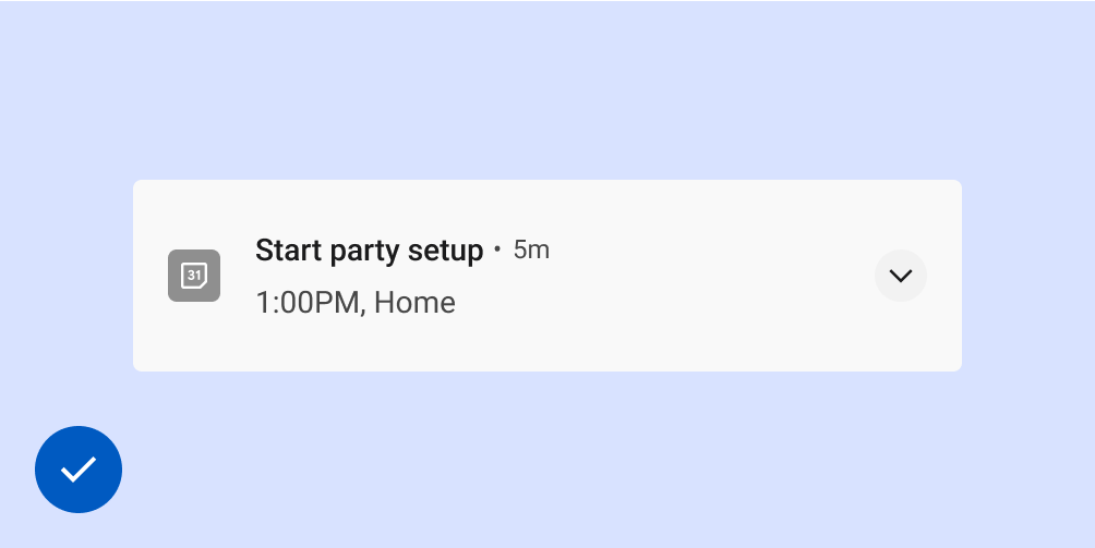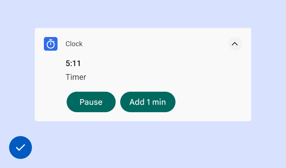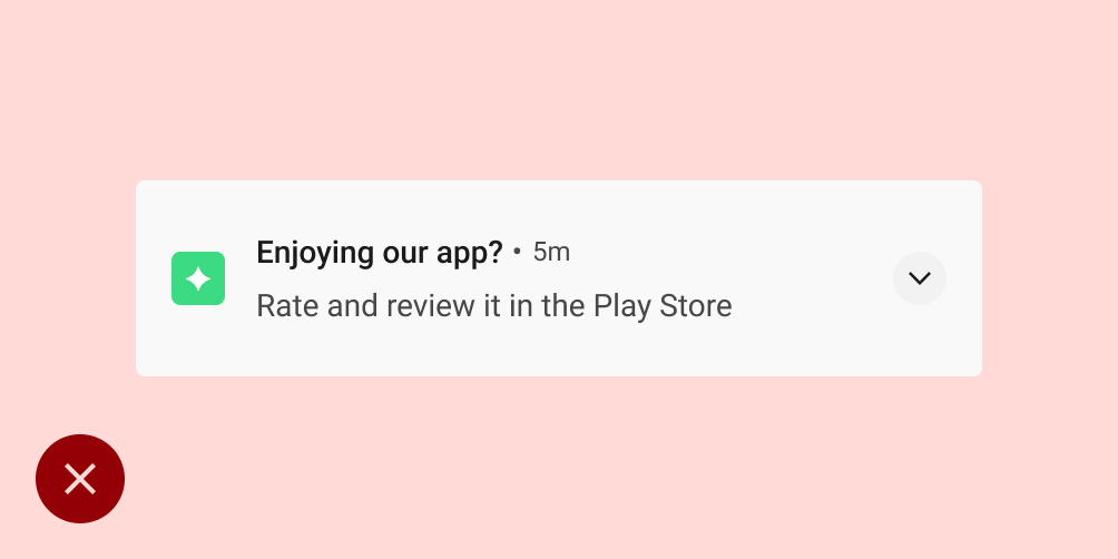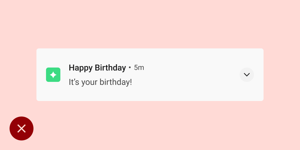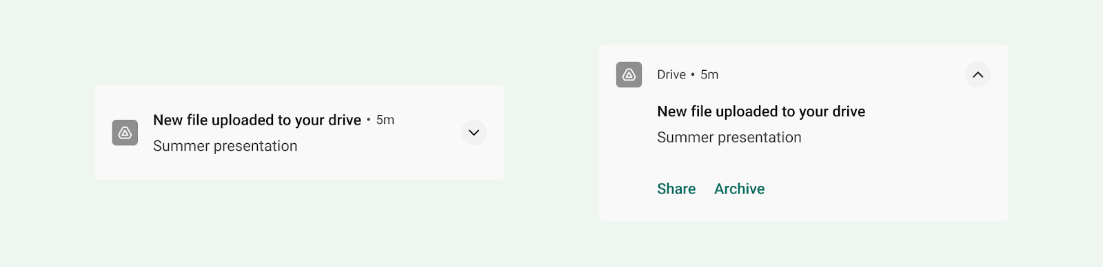 - Azioni: gli utenti possono espandere le notifiche toccando un'icona di indicatore. Le azioni vengono visualizzate con etichette di testo su un colore di sfondo e una posizione distinti.