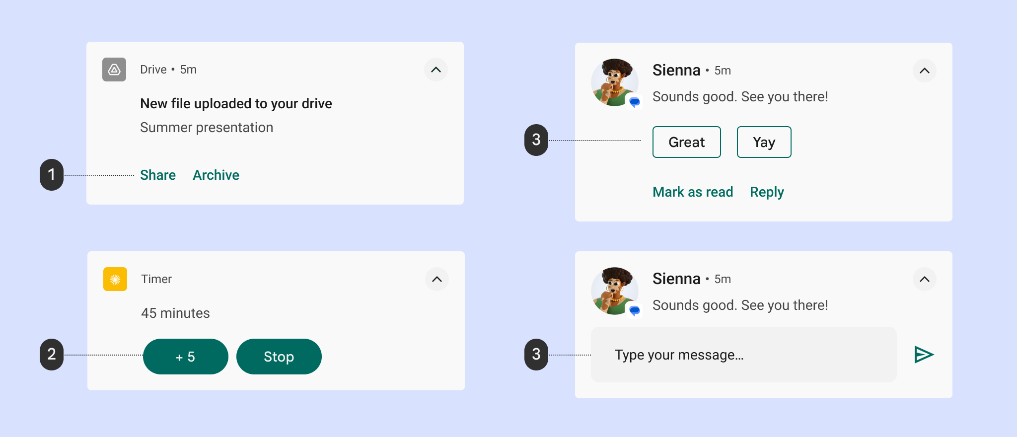 - Indica chiaramente all'utente cosa può fare con una notifica fornendo opzioni in base ai contenuti con pulsanti di testo, digitazione o controlli multimediali.
