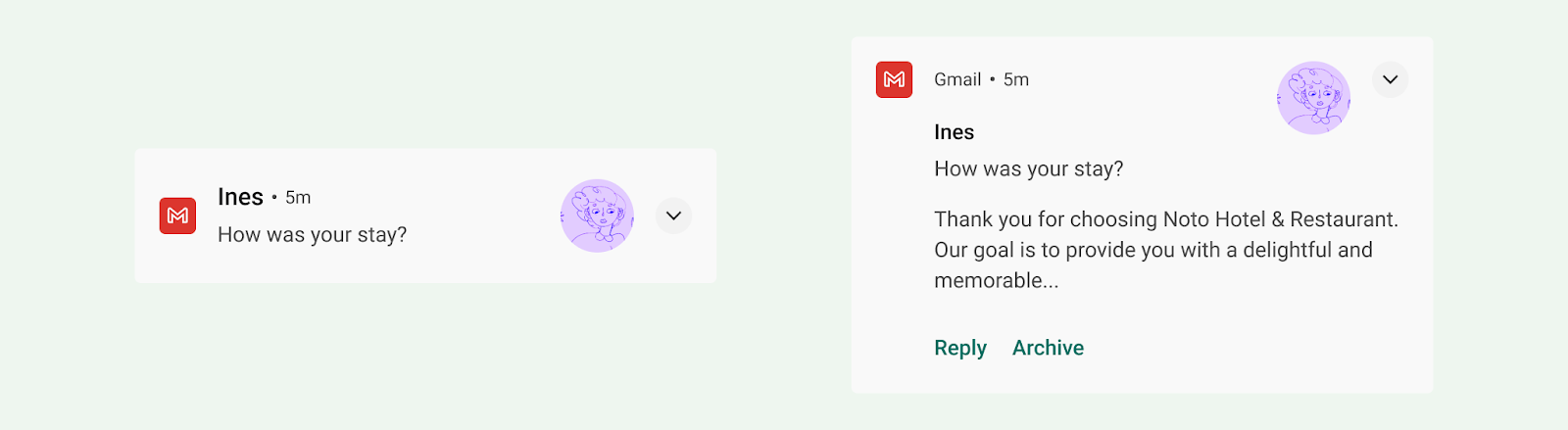 Puoi utilizzare una visualizzazione espansa per mostrare all'utente più informazioni senza uscire dalla notifica.