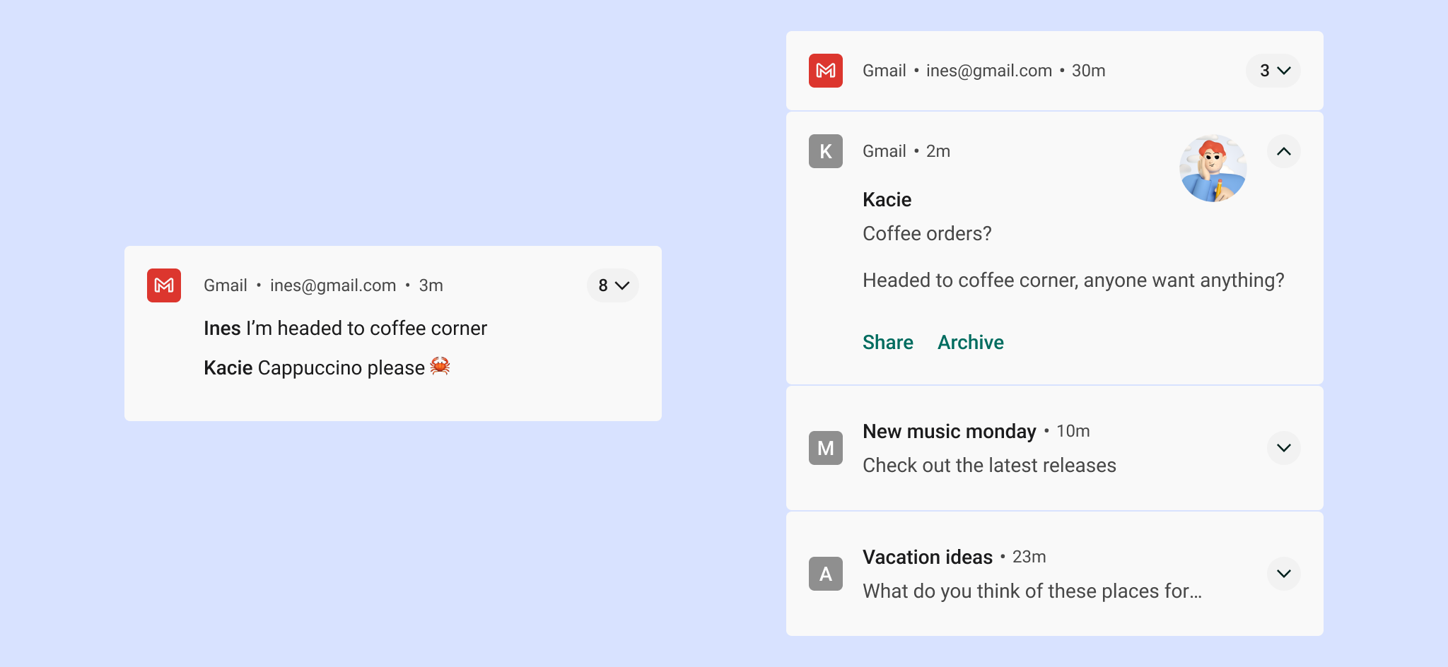 - Se l'utente espande la notifica principale, Android mostra tutte le notifiche secondarie.