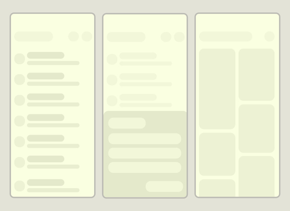 เลย์เอาต์ฟีดจะจัดเรียงองค์ประกอบเนื้อหาที่เทียบเท่ากันในตารางกริดที่กำหนดค่าได้เพื่อให้ ดูเนื้อหาจำนวนมากได้อย่างรวดเร็วและสะดวก ดูข้อมูลเพิ่มเติมเกี่ยวกับ หลักเกณฑ์ Material 3 สำหรับการใช้การ์ดในคอลเล็กชัน ฟีดอาจเป็นการกำหนดค่าแบบรายการหรือแบบตารางกริดบนจอแสดงผลขนาดกะทัดรัด โดยมักจะอยู่ในรูปแบบการ์ดหรือ ไทล์ เนื้อหาอาจเป็นแบบไดนามิก ซึ่งหมายความว่า "ป้อน" จากแหล่งที่มาภายนอกแบบไดนามิก เช่น API
