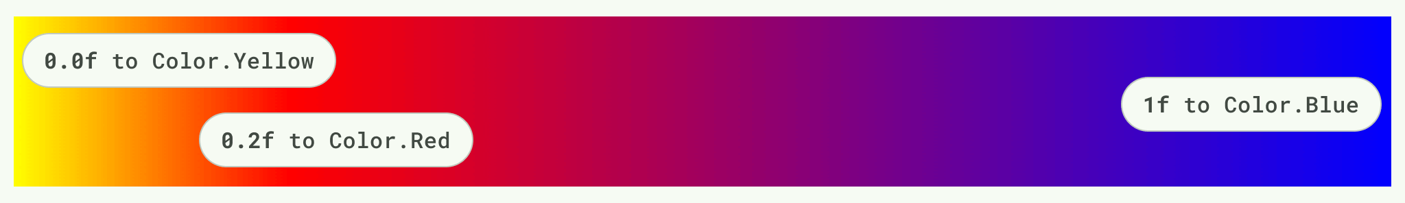 Compose में, स्क्रीन पर कुछ भी ड्रॉ करने के लिए ब्रश का इस्तेमाल करें. अलग-अलग रंगों या ग्रेडिएंट वाले आकार बनाने के लिए, अलग-अलग ब्रश का इस्तेमाल किया जा सकता है. अलग-अलग ग्रेडिएंट इफ़ेक्ट पाने के लिए, पहले से मौजूद ग्रेडिएंट ब्रश का इस्तेमाल करें. इन ब्रशिंग की मदद से, उन रंगों की सूची तय की जा सकती है जिनसे आपको ग्रेडिएंट बनाना है.