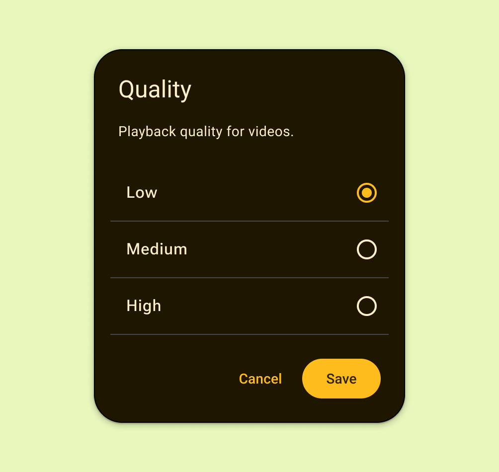 Presenta botones de selección en un diálogo o una pantalla secundaria. No uses botones de selección si el parámetro de configuración tiene un estado booleano o menos de 2 opciones.