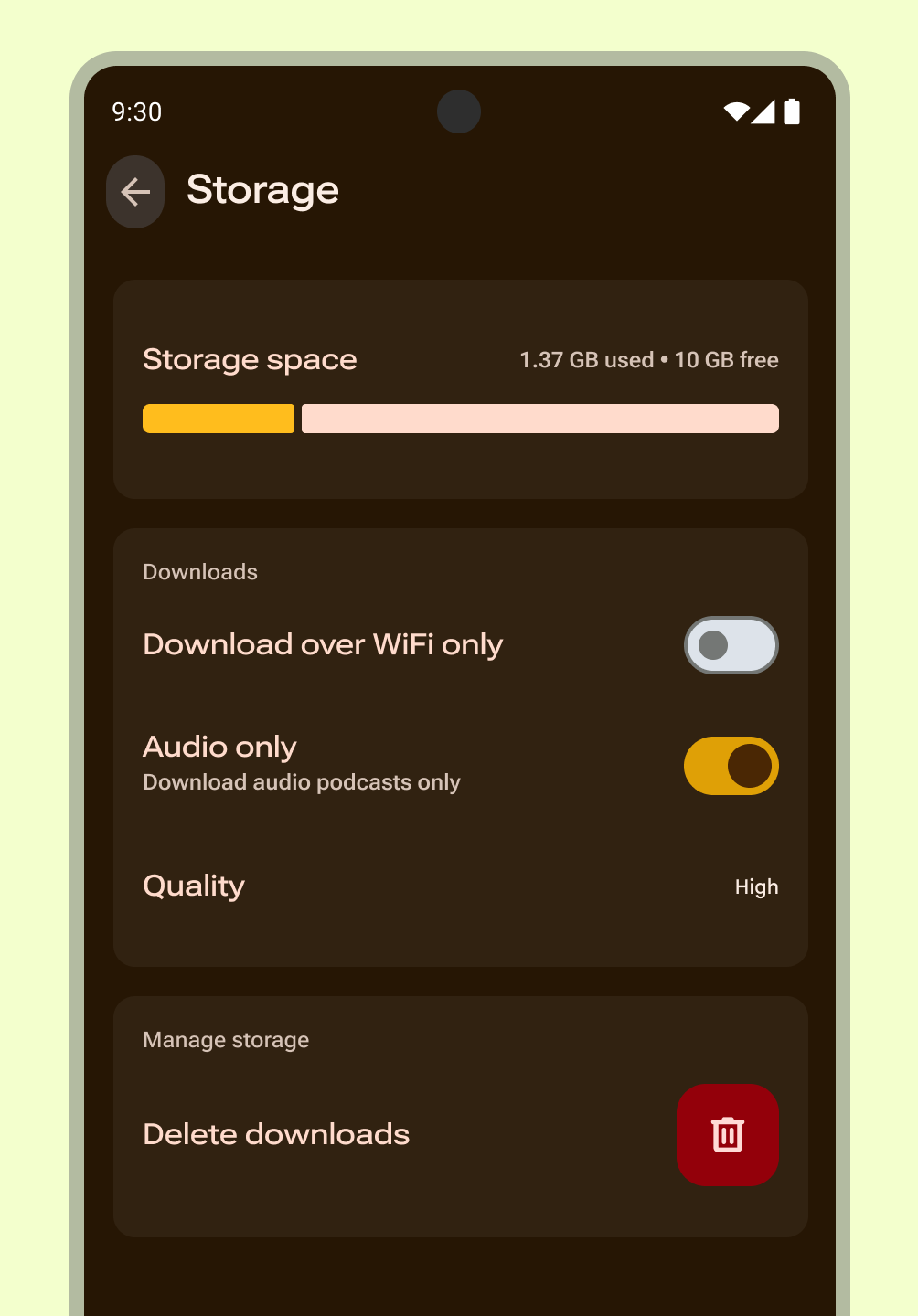 Wybrać ustawienia, które powinny być określane w aplikacji, i wyeliminować preferencje, które lepiej określić w ustawieniach urządzenia lub obsługiwać w ramach usługi. Unikaj na przykład zastępowania motywów systemowych, chyba że rozszerzasz możliwości personalizacji aplikacji.