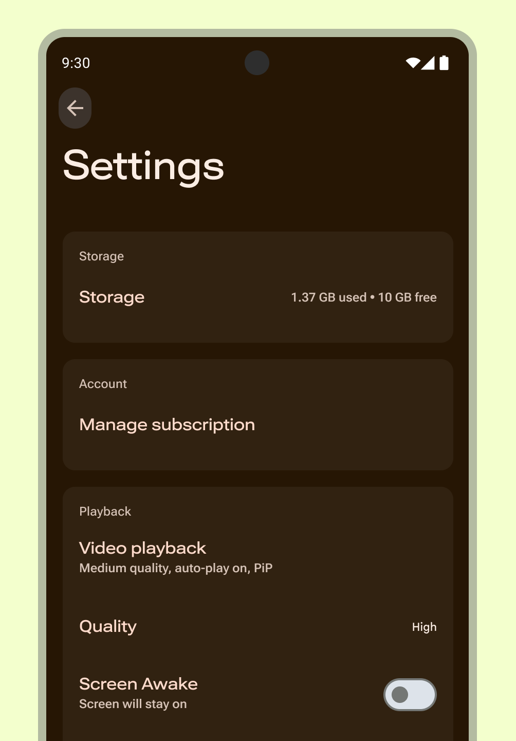 ผู้ใช้สามารถดูการตั้งค่าที่สำคัญที่สุดและที่ใช้บ่อย รวมถึงค่าของการตั้งค่าได้อย่างรวดเร็ว สร้างหน้าภาพรวมโดยใช้เลย์เอาต์รายการ ใช้คอมโพเนนต์ Material Design เพื่อให้ประสบการณ์การใช้งานสอดคล้องกัน หากจำเป็น ให้สร้างหน้าจอแยกต่างหากในแอปสำหรับปลายทาง เช่น บัญชี ข้อมูลแอป ความช่วยเหลือ และความคิดเห็น