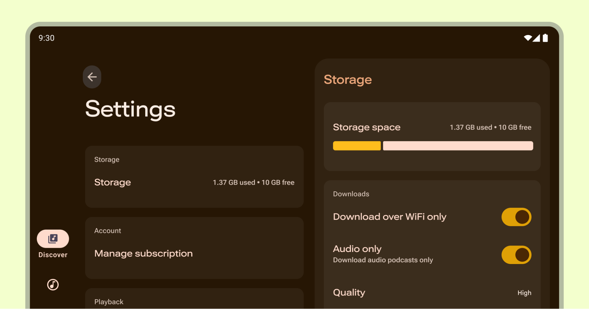 使用列表-详情规范布局可让您快速将设置屏幕调整为适合大屏设备。将每个屏幕视为一个容器窗格,以实现流畅的适配。