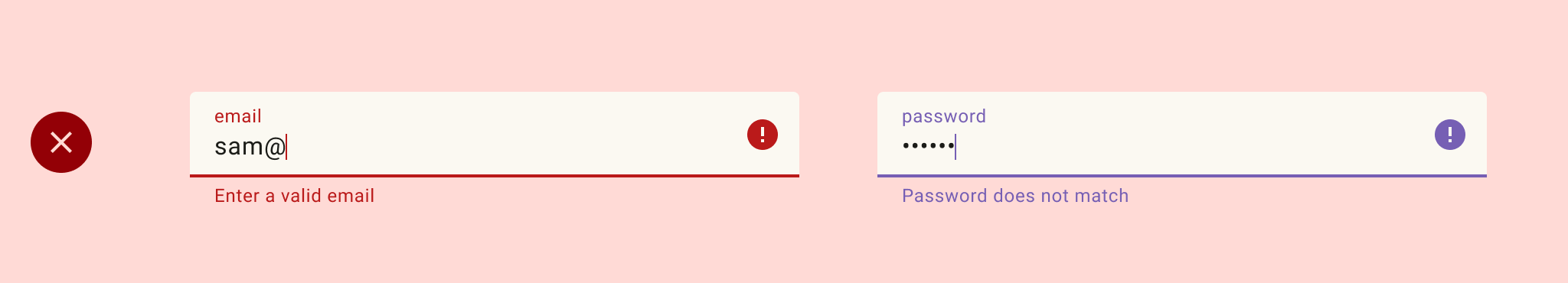 Dans l'exemple suivant, une application utilise le rouge pour indiquer une erreur dans un champ de texte, mais le violet pour l'autre. Cela peut prêter à confusion lorsque vous parcourez un formulaire.