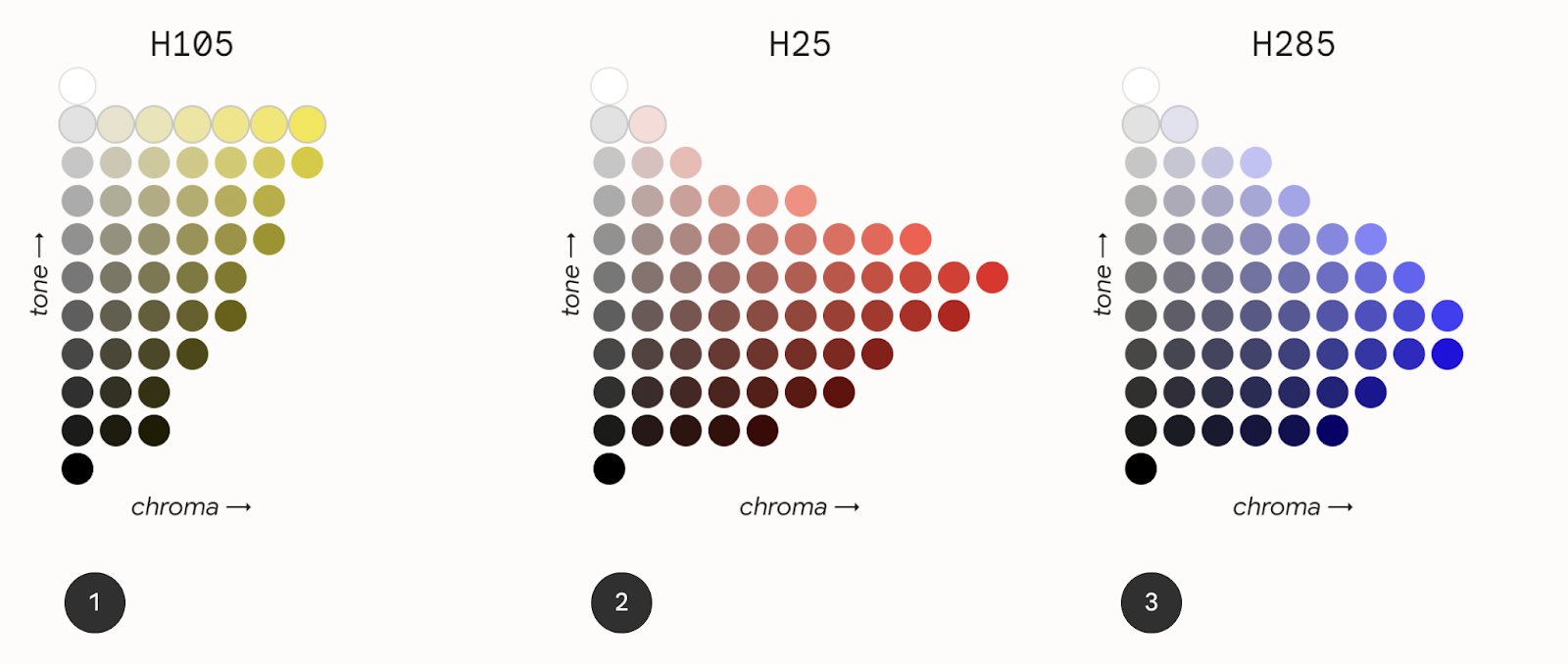 Material 3 (M3) a introduit HCT, un nouvel espace de couleurs qui utilise la teinte, la chromie et le ton pour définir des couleurs qui sont visuellement précises par rapport à d'autres modèles tels que TSL.
