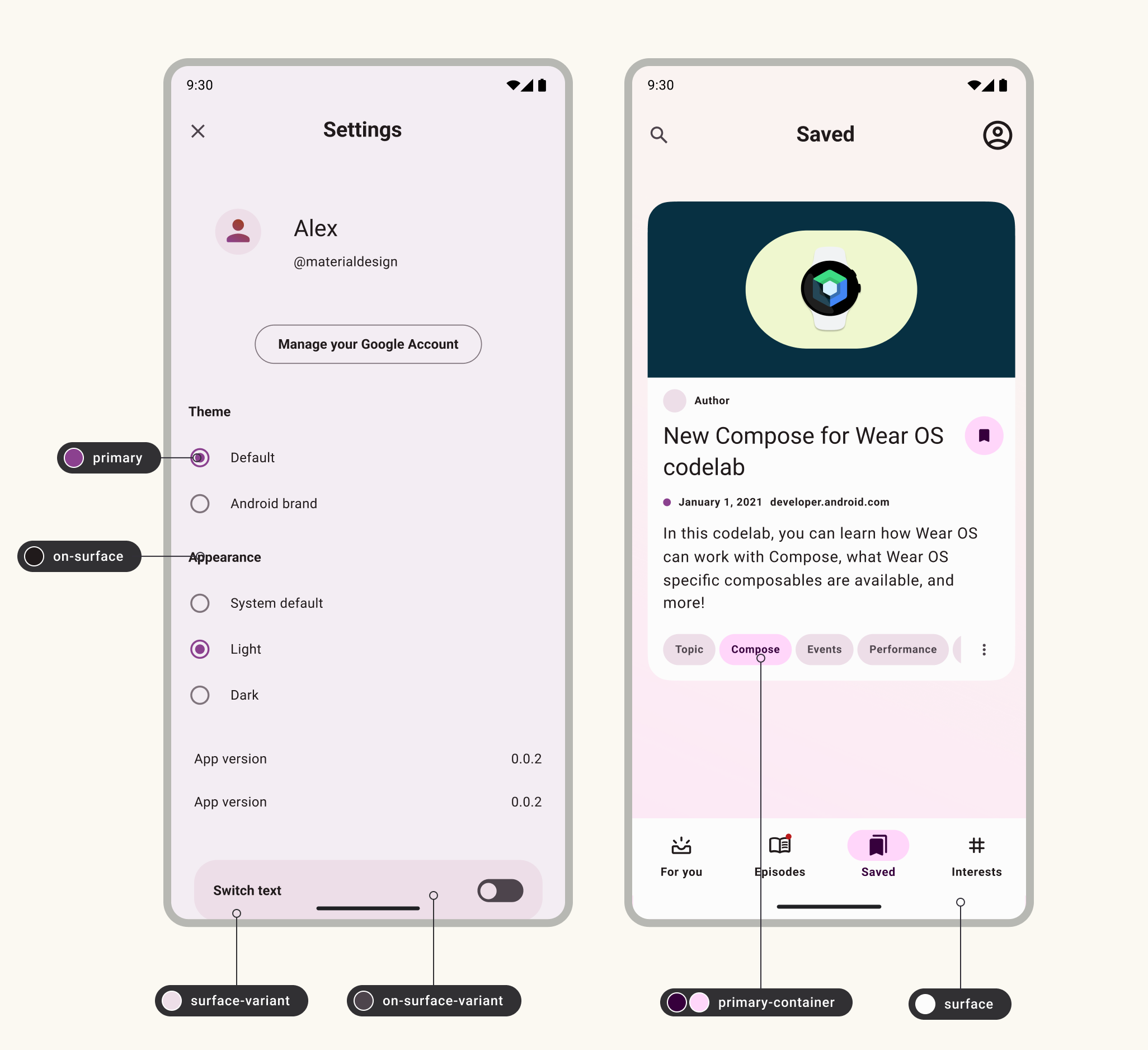 Consultez l'exemple Figma "Maintenant sur Android" pour obtenir des exemples de mappage des rôles de couleur.