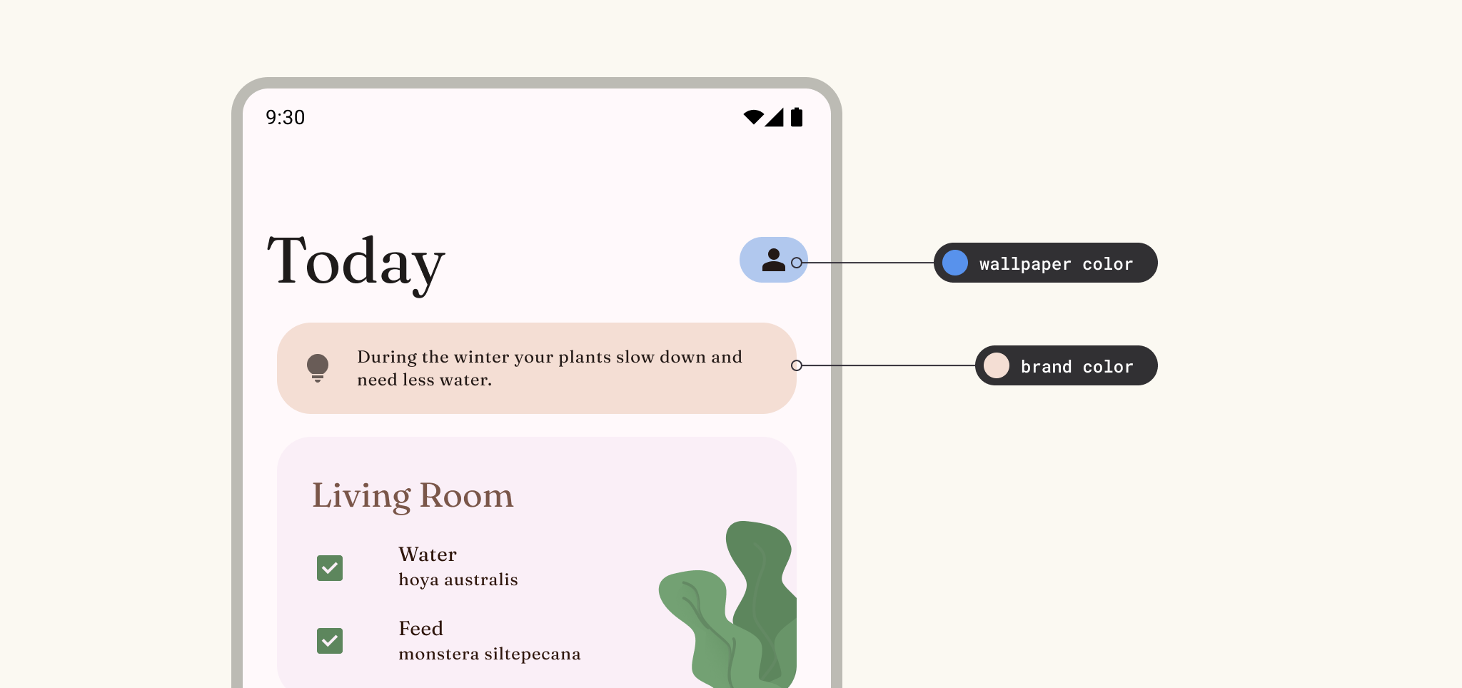 User-generated themes are supported by dynamic color, which we made available with Material You starting in Android 12. When enabled, dynamic color derives custom colors from a user's wallpaper to be applied to their apps and system UI. This color palette is used as the starting point to generate light and dark color schemes.