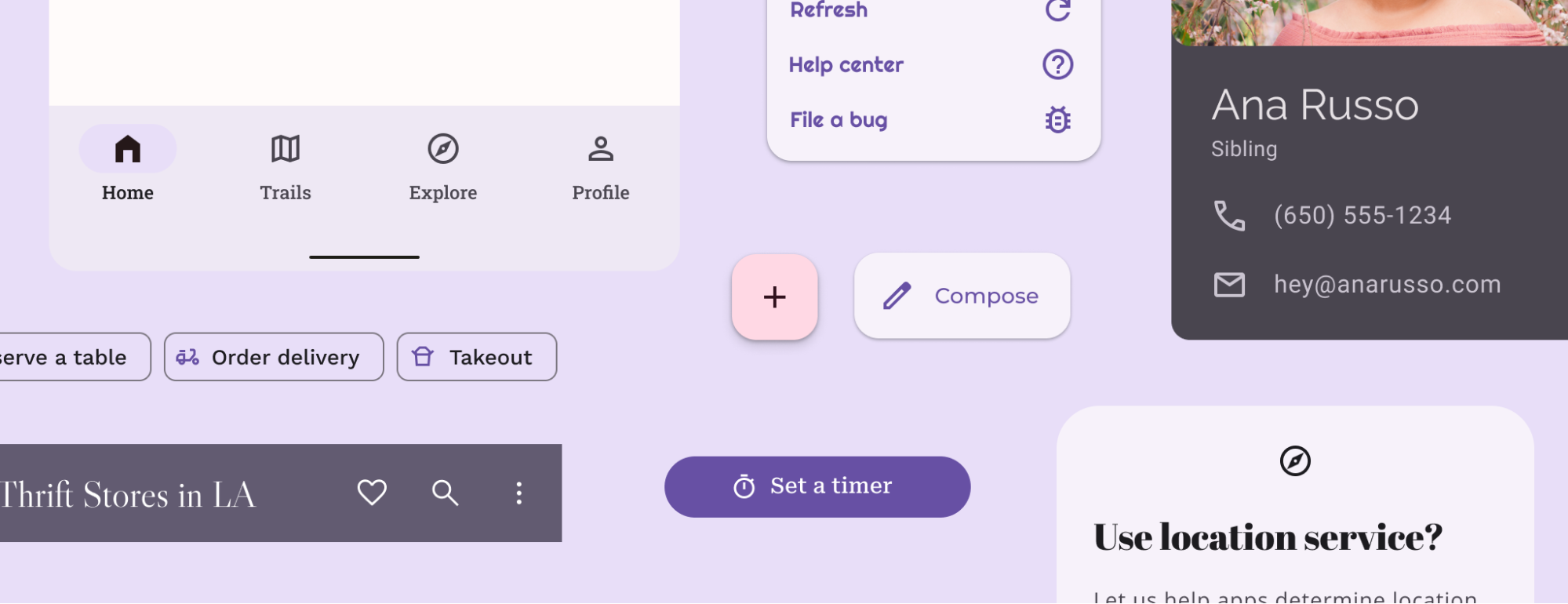 Personalizzare la forma degli angoli del contenitore oltre i valori predefiniti di base aiuta a definire il carattere della tua app. Ad esempio, puoi utilizzare angoli completamente arrotondati per creare un'atmosfera più soft e divertente oppure un taglio angolare per un'atmosfera più seria. Dai un'occhiata ai token e agli stili delle forme per i componenti Material.