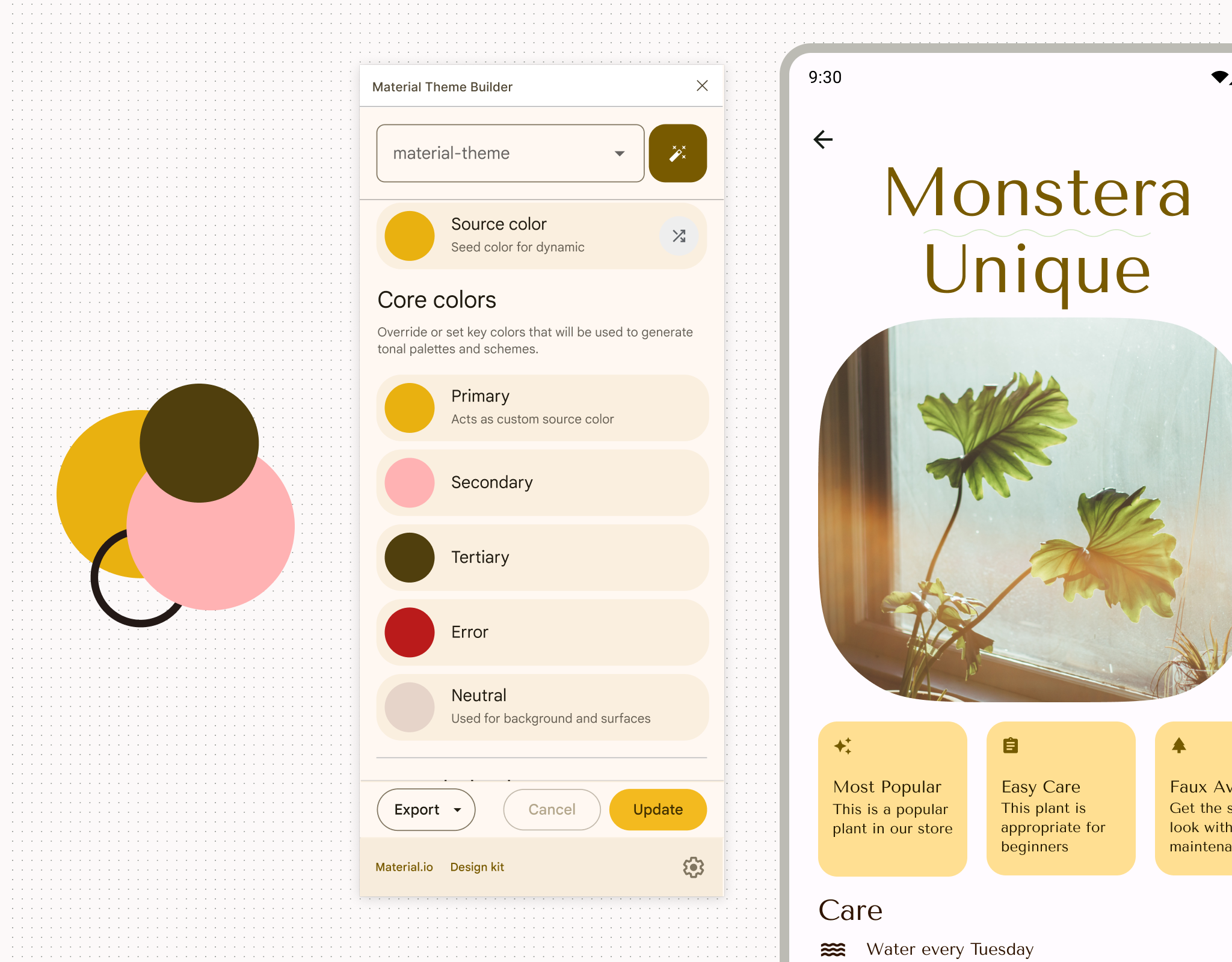 Puoi utilizzare il plug-in Figma di Material Theme Builder per personalizzare un tema Material. La creazione di un tema con questo strumento ti consente di avere file di temi implementabili con combinazioni di colori chiare e scure già generate, il che ti consente di perfezionare la personalizzazione aggiornando il file del tema esportato con i valori esatti.